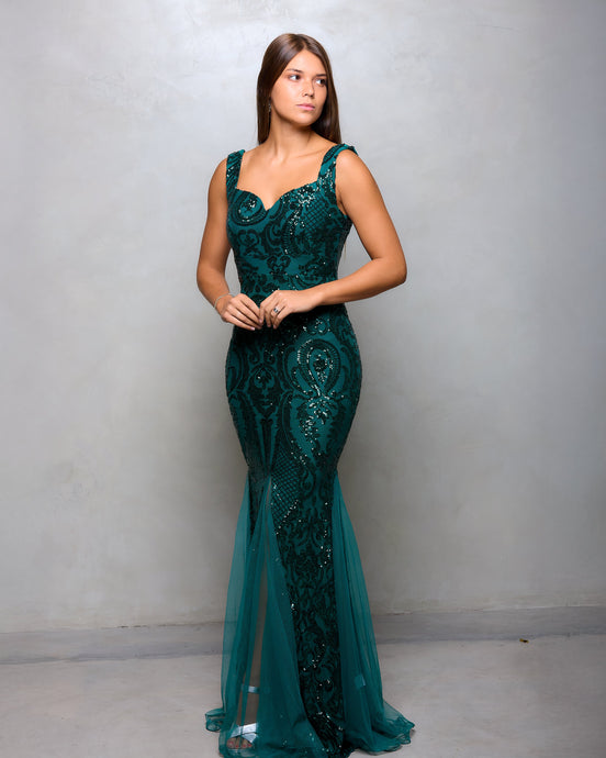 VESTIDO LARGO SIRENA BORDADO HOJAS