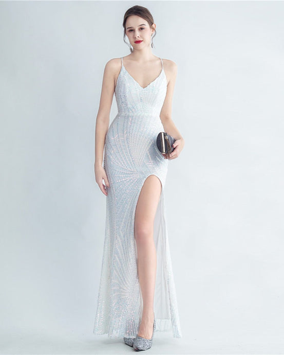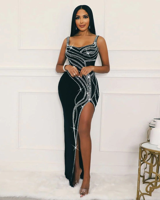 VESTIDO LARGO ESCOTE V LINEAS LENTEJUELAS