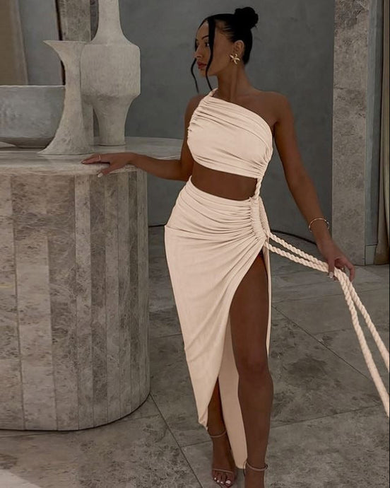 VESTIDO LARGO UN HOMBRO Y TAJO PROFUNDO